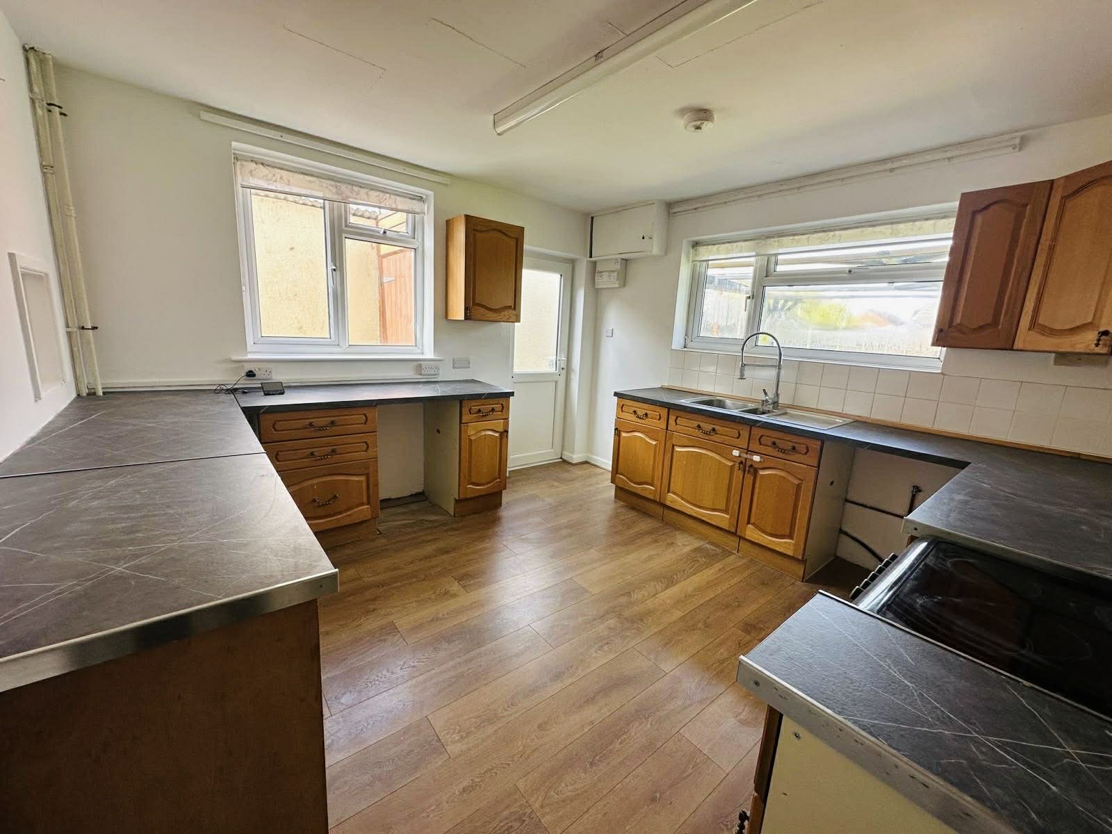 Wood faced units with worktops above comprising 1 ½ bowl single drainer sink unit with mixer tap set in worktop with range of fitted cupboards and drawer units under. Appliance space with plumbing for dishwasher. Boiler for central heating and domestic hot water. Further range of base and eye level wall units. Dual aspect room with sealed double glazed windows to side and rear. Electric cooker point. Radiator. Door to
