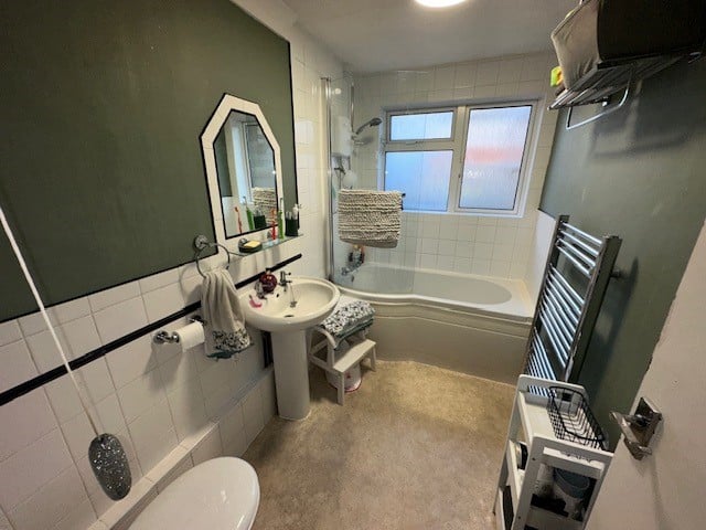 Dual aspect room with frosted double glazed window to rear and side. P panelled bath with separate thermostatically controlled shower unit above with glazed shower door adjacent. Pedestal wash hand basin. Low level WC. Part tiled walls. Ladder effect heated towel rail.
