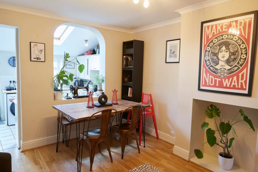 Most attractive fitted kitchen with rolled edge worktops comprising one and half bowl single drainer sink unit set in worktop with fitted cupboards under. Integrated dishwasher, integrated fridge/freezer, induction hob with modern built in oven under and extractor hood above. Tiled flooring. Radiator. Power points. Open plan dining area with built in storage, hardwood flooring leading to staircase up to first floor landing.