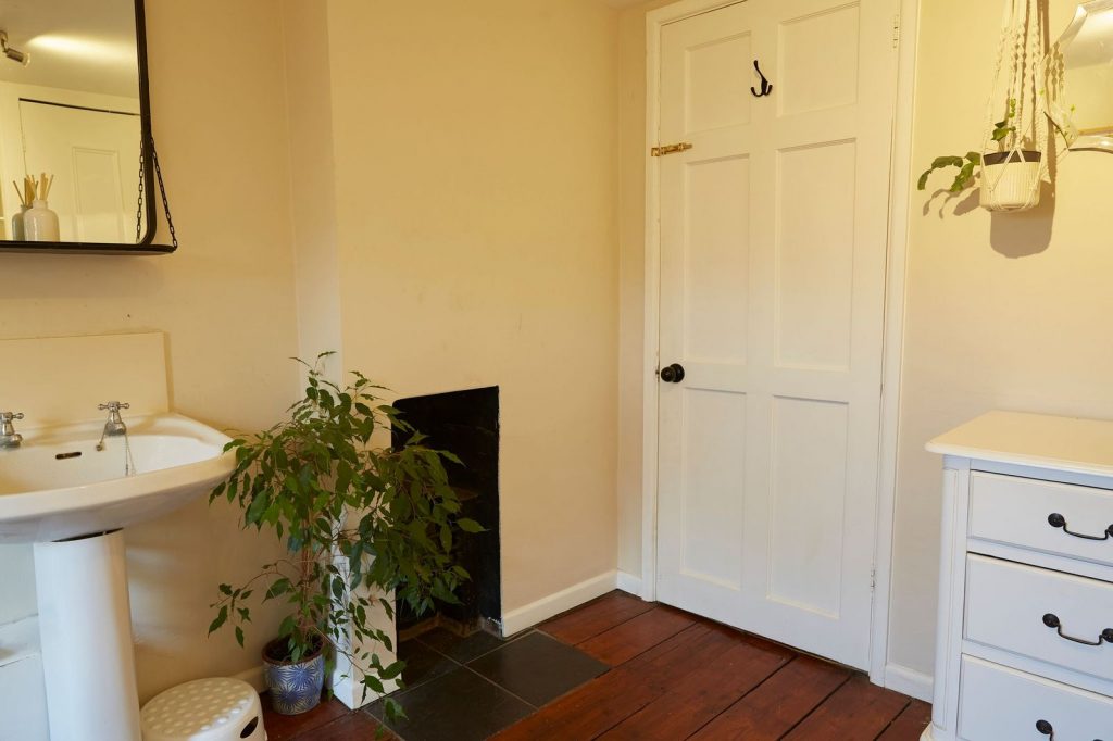 Panelled bath with thermostatic shower above. Pedestal hand wash basin. Low level W/C. Airing cupboard with storage / shelving. Further cupboard housing brand new Viessmann Combi Boiler. Fireplace feature. Hardwood flooring. Radiator.